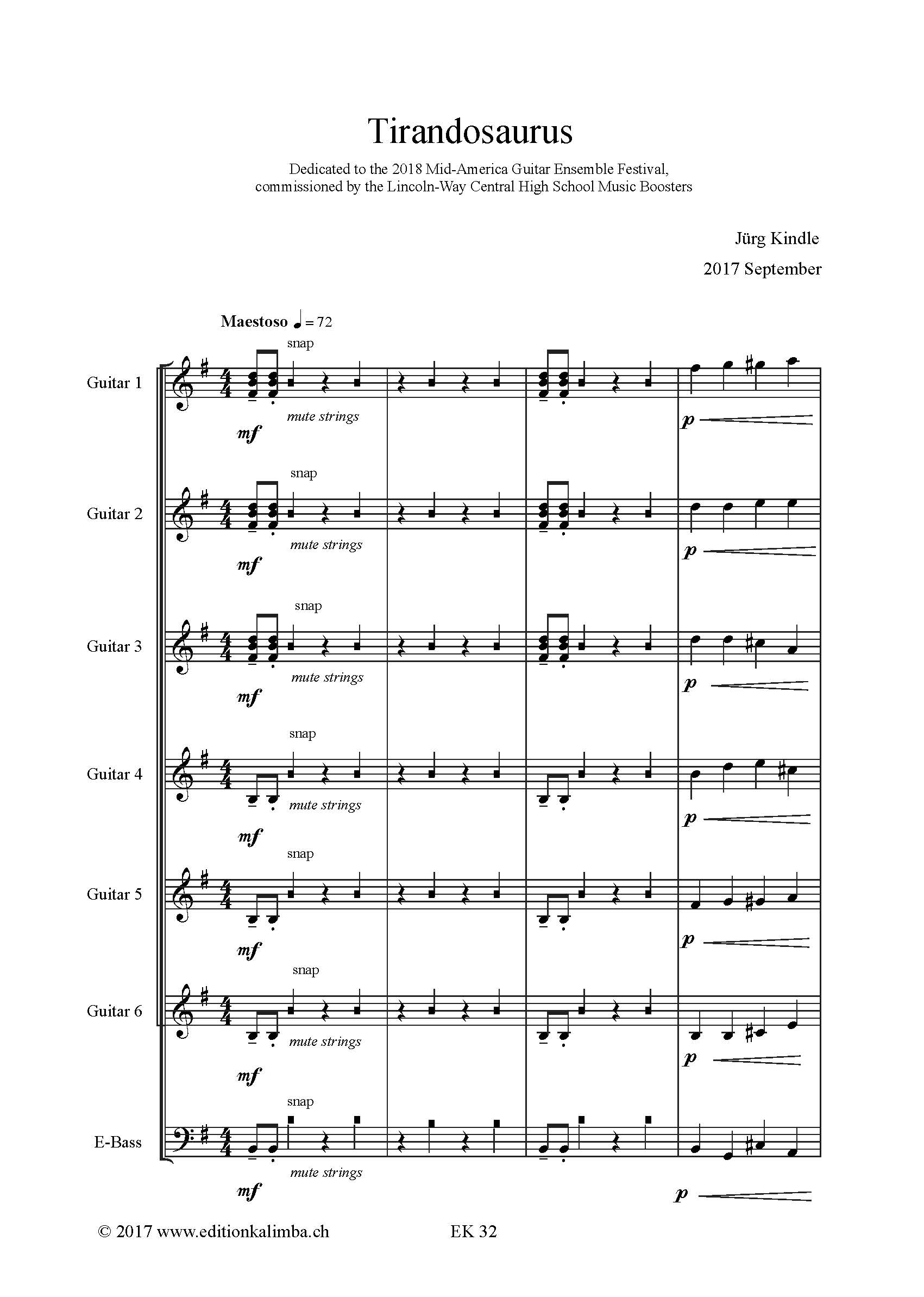 6 guitars and bass guitar, easy to advanced level.The piece is dedicated to the 2018 Mid-America Guitar Ensemble Festival,commissioned by the Lincoln-Way Central High School Music Boosters. Score 30 pages guitar 1-6&bass each 8 pages.Duration 8 minutes.